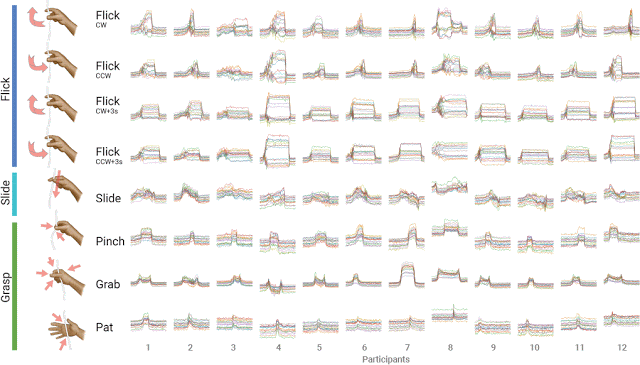 我们收集了 12 位新参与者的数据,共得到 864 个手势样本(每人各做八个手势,重复九次),每个样本有 16 个特征,随时间线性插值得到 80 个观察结果。参与者按自己的风格做八个手势(不提供反馈),这是因为我们想要适应个体差异,毕竟分类高度依赖于用户风格(“接触”)、偏好(“捏/抓的方式”)和个体差异(如手掌大小)。为此,我们专门为依赖于用户的训练设计了流水线,以便涵盖不同参与者之间的个体风格差异,例如对顺时针/逆时针的使用不一致、表示时间的手势中存在重叠(例如,轻弹与轻弹和握住,以及类似的捏和抓手势)。对于不依赖用户的系统,我们需要解决如下差异:更严格的一致性说明,来自更大人群的数据,以及更多样化的环境等。训练期间的实时反馈将有助于减少差异,因为用户会学习调整其行为。