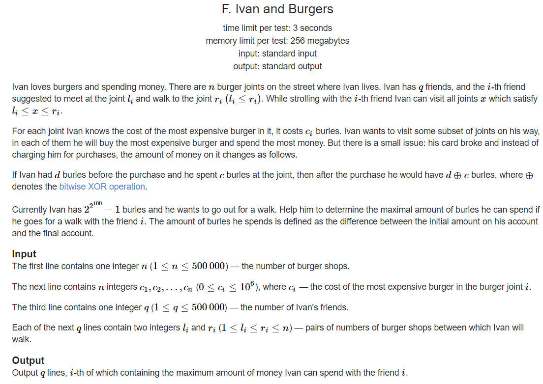 我是靠谱客的博主 殷勤纸飞机,这篇文章主要介绍Codeforces Round #532 (Div. 2) F. Ivan and Burgers(可持久化异或线性基+双指针),现在分享给大家,希望可以做个参考。