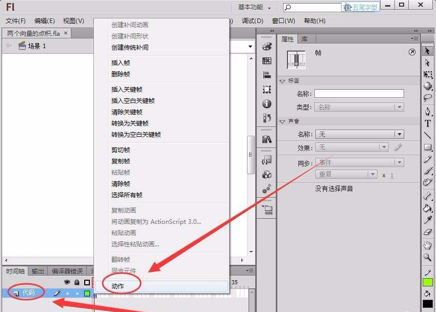 4、新建一个Flash文档,将图层命名为代码,在代码图层的第1帧右击,打开动作面板。