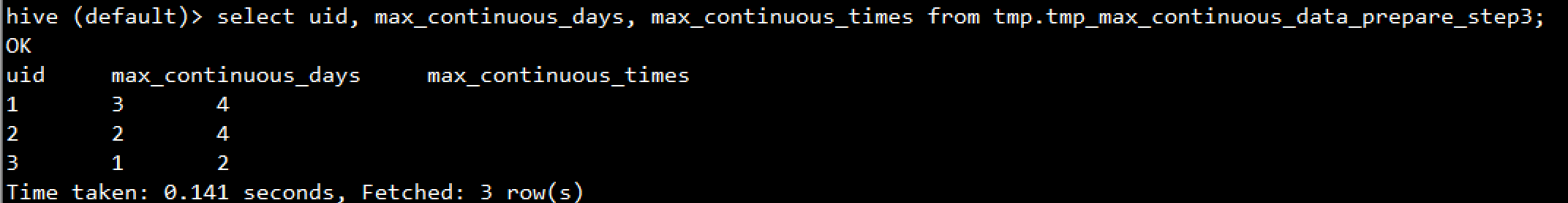 SELECT uid, continuous_days AS max_continuous_days, continuous_times AS max_continuous_times