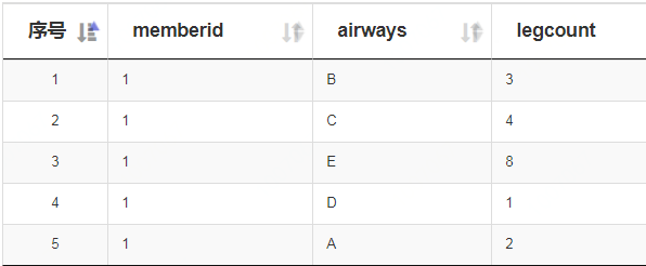 select 1 as memberid,'E' as airways,8 as legcount