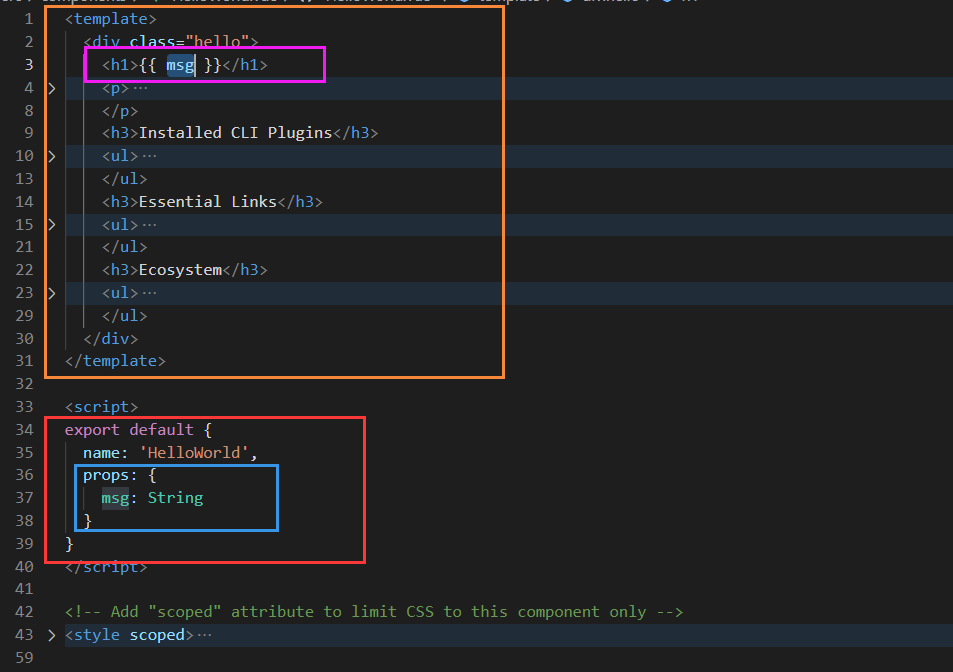 红框表示的是一个vue实例对象,蓝框表示的是Model模型中的数据,橙框表示的是 View视图,紫框中的msg表示一个数据变量,需要从蓝框中的props中传过来