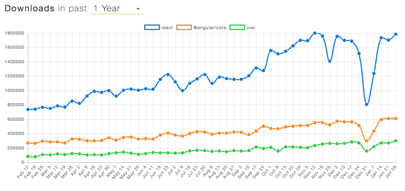 Javascriptreport 近日发布了一篇文章来比较流行前端框架的走势。走势图是通过统计最新的数据,并与前一年的数据进行比较而生成。数据来源于 npm trends 的每日下载量。