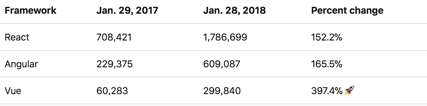 如果按目前的趋势继续下去的话,Vue 或将会在 2018 年底或 2019 年初取代 Angular ,成为使用率第二大的框架。