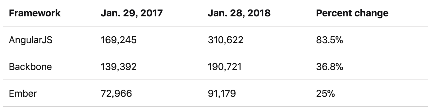另外三个老牌但较有影响力的框架,AngularJS、Backbone 和 Ember ,虽然如今在知名度上弱于前面的三巨头,但过去一年仍保持增长趋势。