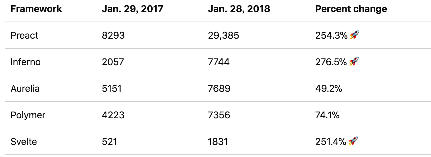 其中,Inferno、Preact 和 Svelte 的增长率仅低于 Vue 。Preact 是该梯队的领导者,有望成为最受欢迎的 React 替代品。
