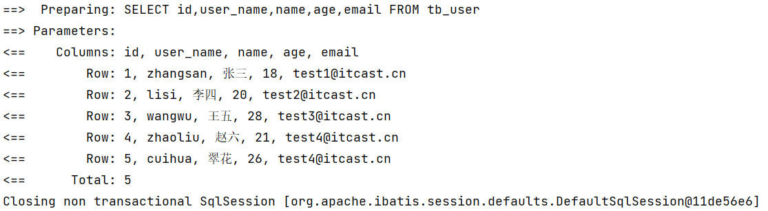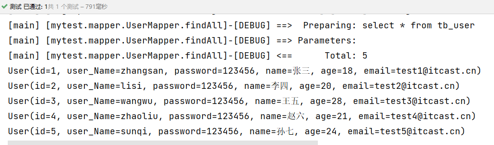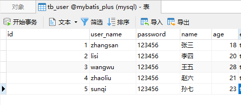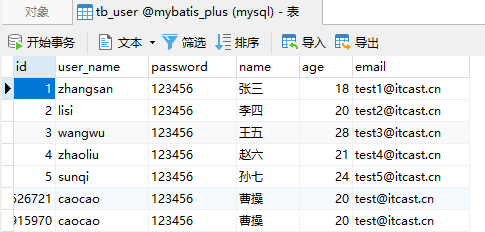INSERT INTO `tb_user` (`id`, `user_name`, `password`, `name`, `age`, `email`) VALUES ('1', 'zhangsan', '123456', '张三', '18', 'test1@itcast.cn');