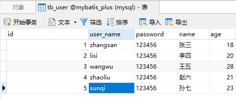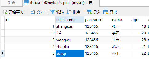INSERT INTO `tb_user` (`id`, `user_name`, `password`, `name`, `age`, `email`) VALUES ('5', 'sunqi', '123456', '孙七', '24', 'test5@itcast.cn');