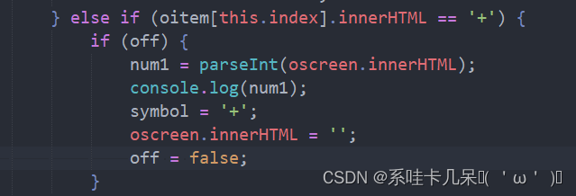 然后通过按运算符号,完成对上一个数字的存储记录,拿到这个数字也是为了方便计算,第二个数字的计算也是如此。当然由于技术不佳目前还只支持两个数字一个符号的运算,要进行多次连算还需要改进。这里符号部分可以看到给了一个off值的判断,也是为了避免用户连续多次对运算符的按动。一个运算符只能按一次