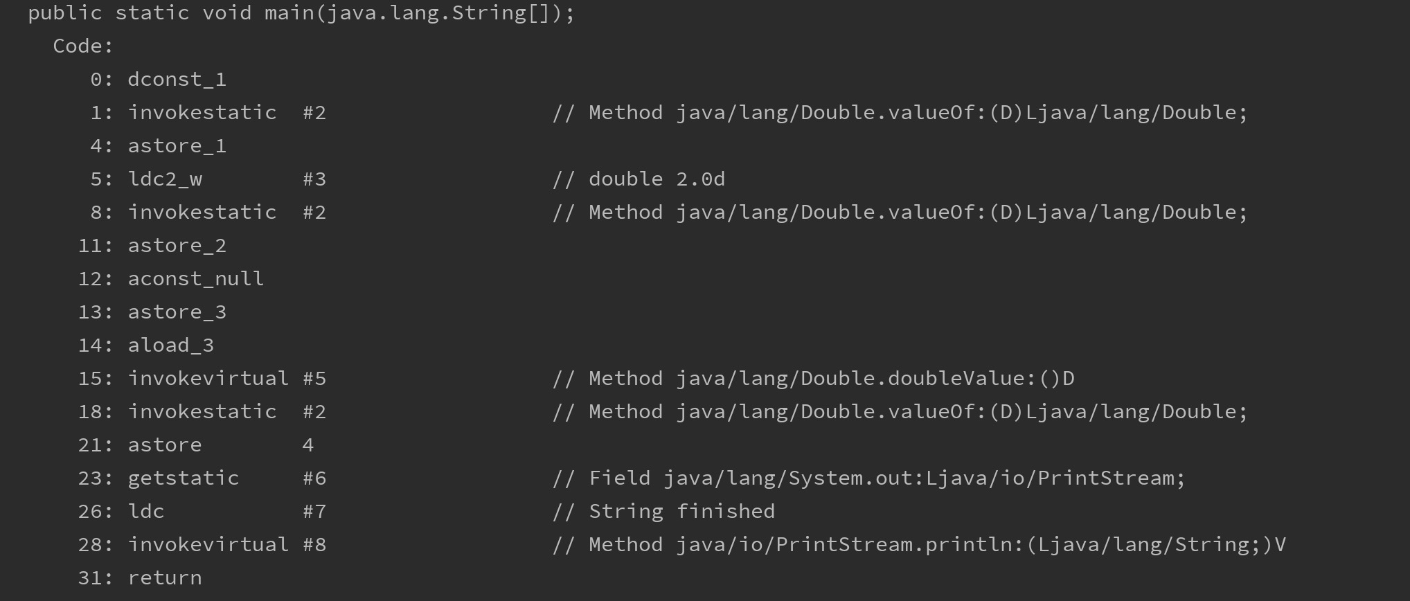 上面的代码能够成功运行,我们来看下反编译出的字节码内容