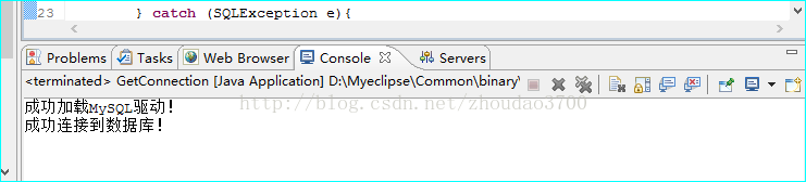 import java.sql.*; public class GetConnection { public static void main(String[] args){ try{ //调用Class.forName()方法加载驱动程序 Class.forName("com.mysql.jdbc.Driver"); System.out.println("成功加载MySQL驱动!"); }catch(ClassNotFoundException e1){ System.out.println("找不到MySQL驱动!"); e1.printStackTrace(); } String url="jdbc:mysql://localhost:3306/stu"; //JDBC的URL //调用DriverManager对象的getConnection()方法,获得一个Connection对象 Connection conn; try { conn = DriverManager.getConnection(url, "root","sa"); //创建一个Statement对象 Statement stmt = conn.createStatement(); //创建Statement对象 System.out.print("成功连接到数据库!"); stmt.close(); conn.close(); } catch (SQLException e){ e.printStackTrace(); } } }