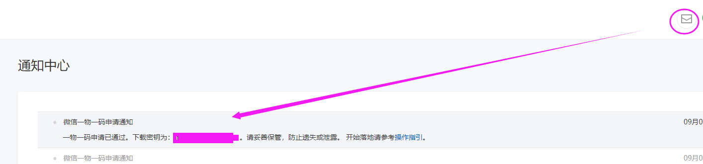 1、获取密钥key:申请一物一码通过后,在【微信公众平台】,消息中心可以获取对应的密钥。