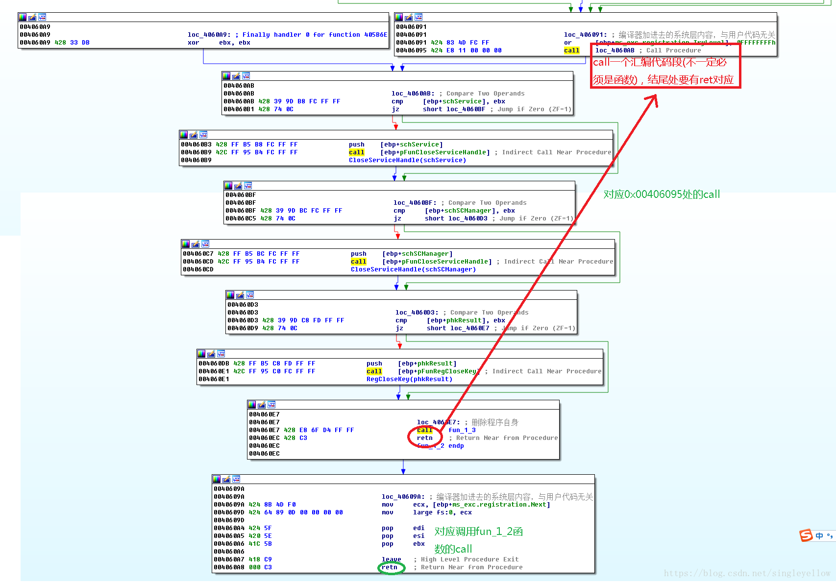 做逆向分析时经常遇到call指令,常用来调用函数;也可以调用一个过程(少见),最近就遇到一个,如下图: