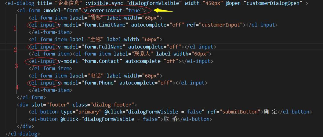 下面是我测试的el-dilalog,只需在el-form中指定v-enterToNext,后面的【=”true"】其实可能省略
