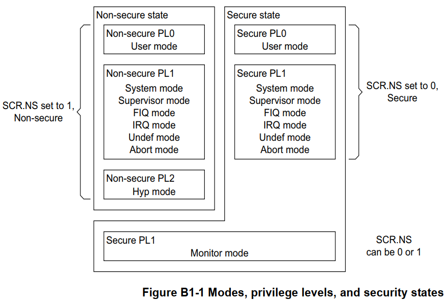 ARMv7架构支持安全扩展,如果使能了安全扩展,ARMv7-A架构分为安全模式(Secure State)和非安全模式(Non-secure State)两个世界。