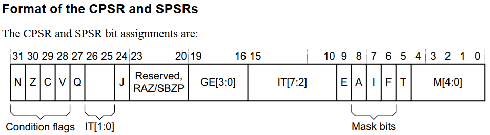 | M[4:0] | 处理器模式:FIQ,IRQ,ABT,SVC,UND,MON,HYP。User模式不能操作 |