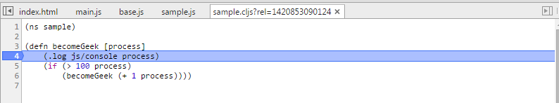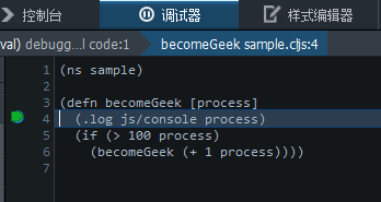 在sample.cljs文件中设置断点,然后调用sample.becomeGeek调试即可!