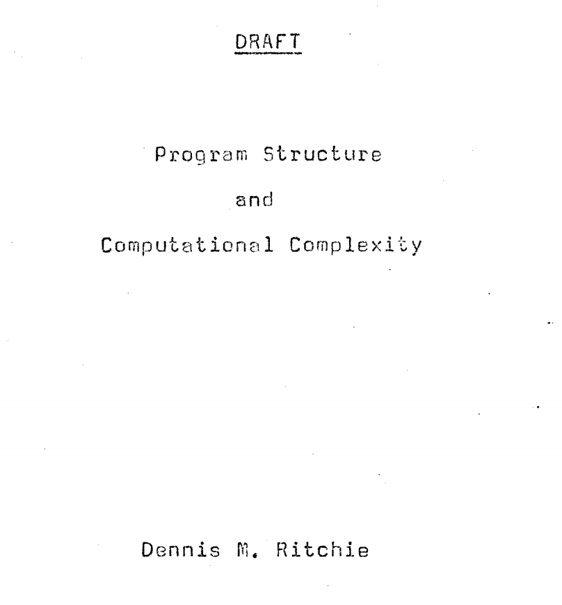 这篇论文写于 1968 年,题目是《Program Structure and Computational Complexity》,当时的 Ritchie 才 27 岁。如今,Ritchie 离我们远去,论文也早已褪色发黄。
