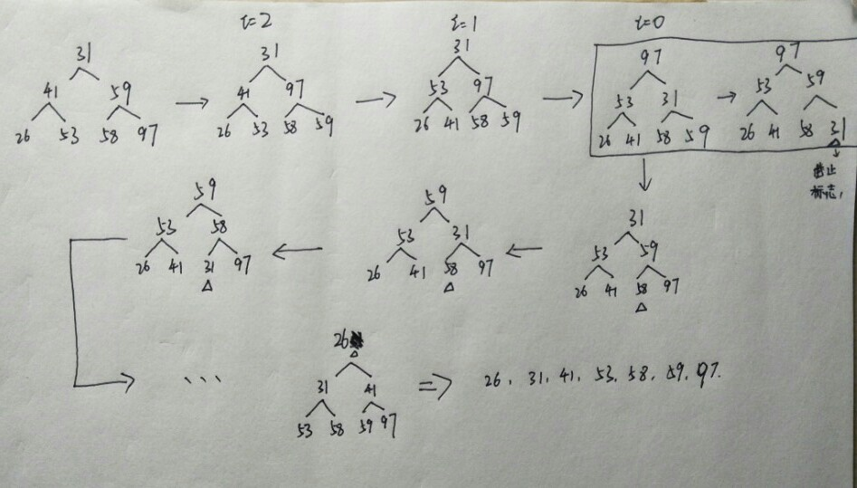 上图为构建初始堆及排序过程,数组中表,97.58,31,26,41,58,31