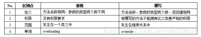 重载(overload):方法重载表示一个类中两个或多个方法名字相同,但方法参数不同。方法参数不同有两层含义:1)参数个数不同,2)参数类型不同。注意:方法的返回值对方法重载没有任何影响。