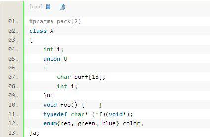 共用体u因为强制为2字节对齐(#pragma pack(2)),所以为14字节,color枚举类型的实例是4字节