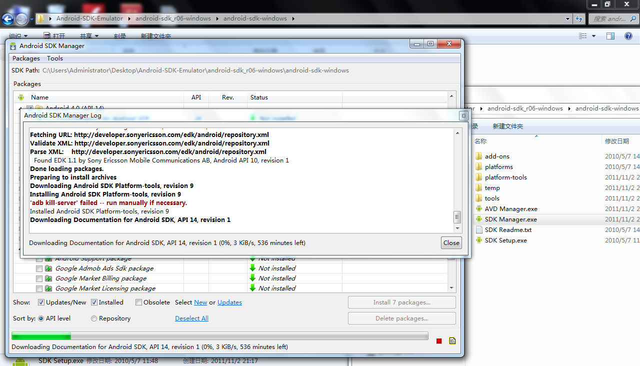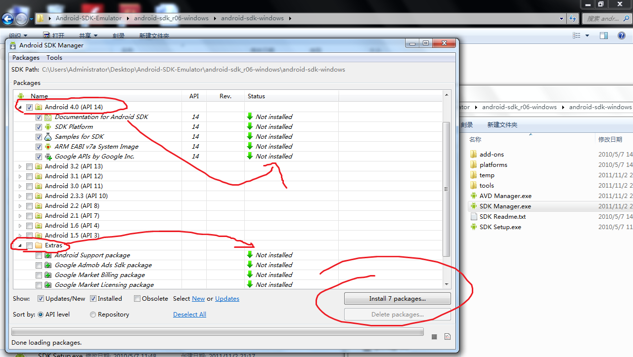 10 全部关闭,然后双击SDK Manager.exe,在Packages项目中选择Android 4.0和Extras中的USB控制器,然后Install
