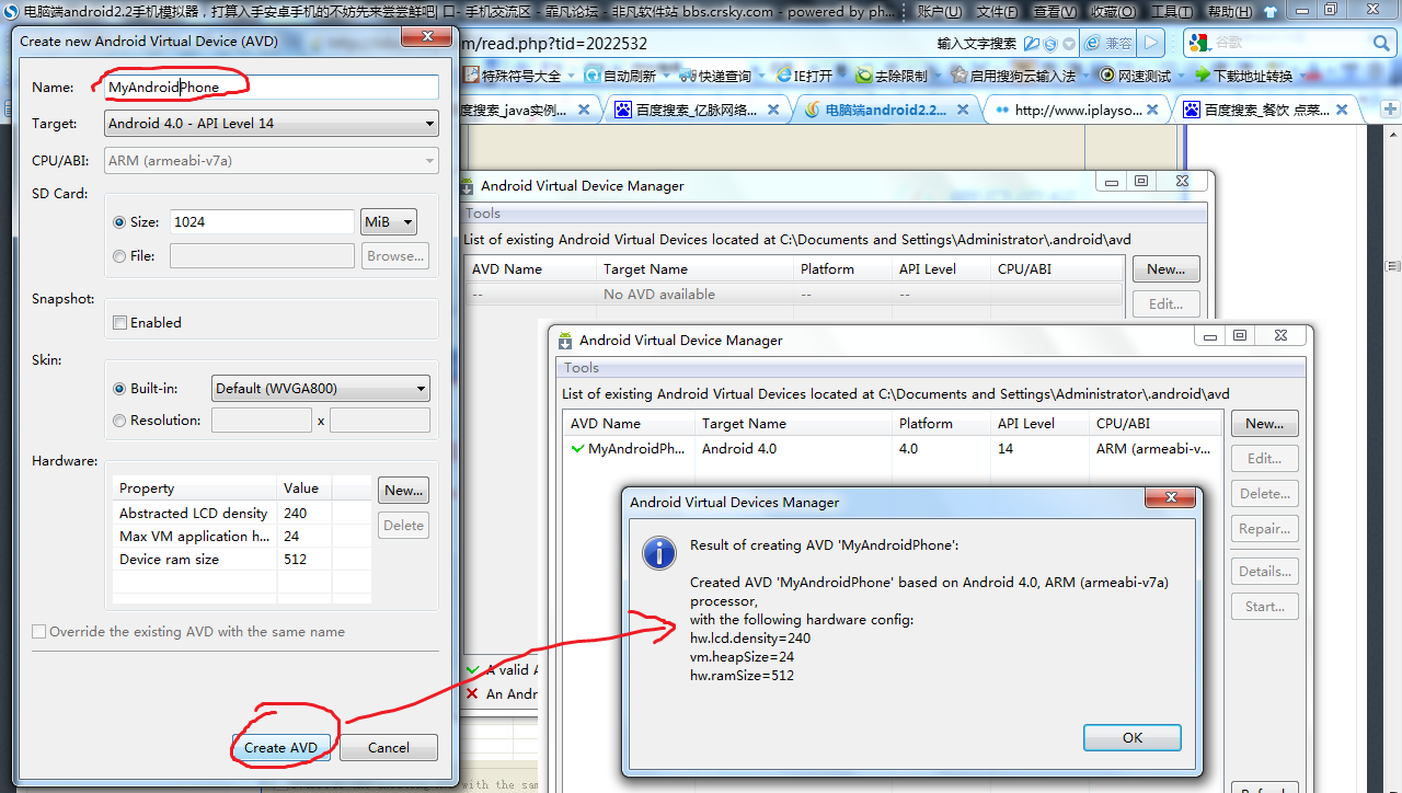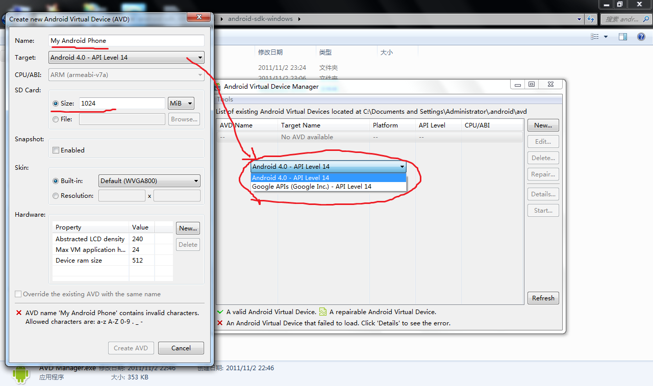 15 输入名称和目标,目标选择Android 4.0。SD Card输入1024,其余保持默认(注意名称不能为My Android Phone这种带有空格的,可以看到底部的按钮"Create AVD"无法点击。)