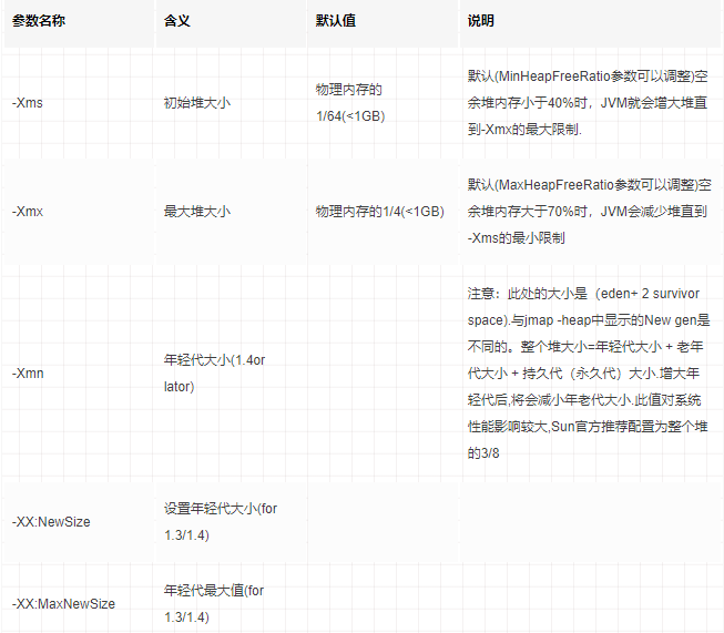 -Xmx –Xms:指定java堆最大值(默认值是物理内存的1/4(<1GB))和初始java堆最小值(默认值是物理内存的1/64(<1GB))