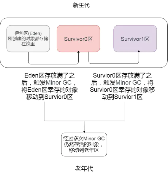 当Eden空间满了之后,会触发一个叫做Minor GC(就是一个发生在年轻代的GC)的操作,存活下来的对象移动到Survivor0区。Survivor0区满后触发 Minor GC,就会将存活对象移动到Survivor1区,此时还会把from和to两个指针交换,这样保证了一段时间内总有一个survivor区为空且to所指向的survivor区为空。经过多次的 Minor GC后仍然存活的对象(这里的存活判断是15次,对应到虚拟机参数为 -XX:TargetSurvivorRatio 。为什么是15,因为HotSpot会在对象投中的标记字段里记录年龄,分配到的空间仅有4位,所以最多只能记录到15)会移动到老年代。老年代是存储长期存活的对象的,占满时就会触发我们最常听说的Full GC,期间会停止所有线程等待GC的完成。所以对于响应要求高的应用应该尽量去减少发生Full GC从而避免响应超时的问题。