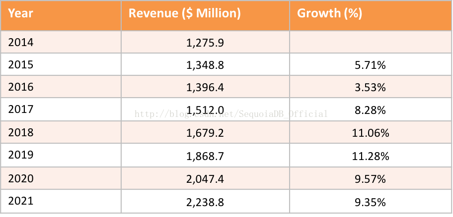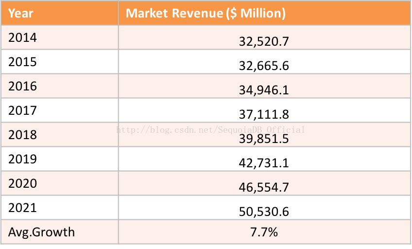 根据Gartner 2017年对于企业级软件市场规模的预测报告(Gartner Enterprise Software Forecast 2017Q1),数据库全球市场规模在2017年将突破370亿美元,并预计在2021年会突破500亿美元的规模。