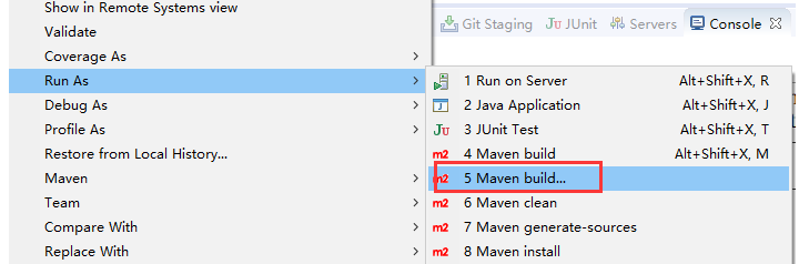 6、上面是在dos下执行mvn命令,那么在eclipse中也同样可以执行mvn命令: