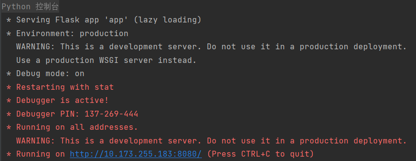 PIN是 Werkzeug(它是 Flask 的依赖项之一)提供的额外安全措施,以防止在不知道 PIN 的情况下访问调试器。 您可以使用浏览器中的调试器引脚来启动交互式调试器。