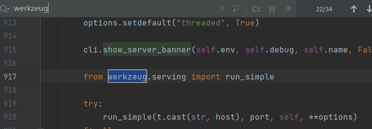 转到了flask/app.py,直接Ctrl+F搜索werkzeug