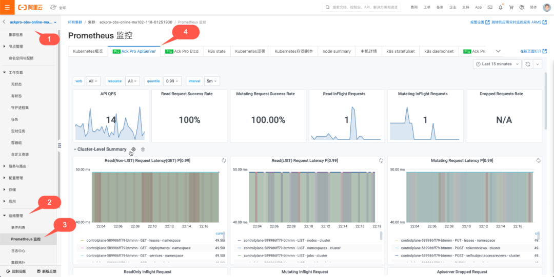 首先来看 ACK Pro 的可观测性能力。监测大盘入口如下: