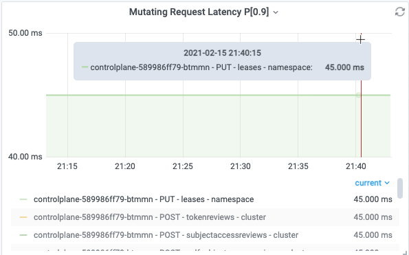下图表示在采样周期内,APIServer 收到 PUT leases 的请求,每个采样期内 P90 RT 是 45ms。