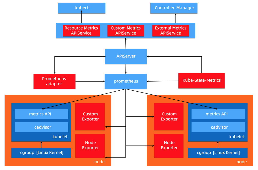 除了上述指标,K8s 提供了通过 API 方式对外透出指标的监测接口标准,具体包括 Resource Metrics,Custom Metrics 和 External Metrics 三类。