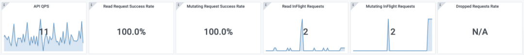 显示了核心的指标,包括 APIServer 总 QPS、读请求成功率、写请求成功率、Read Inflight Request、Mutating Inflight Request 以及单位时间丢弃请求数量 Dropped Requests Rate。