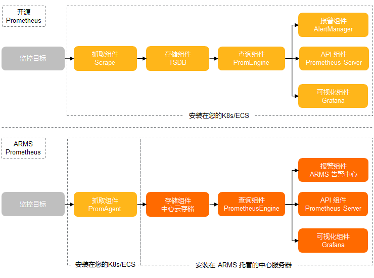 下图概要对比了开源 Prometheus 和阿里云 Prometheus 的模块划分和数据链路。