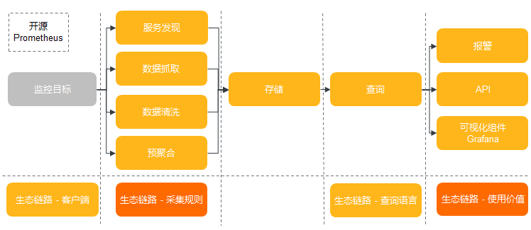 Prometheus 可以周期性采集组件暴露在 HTTP(s) 端点的/metrics 下面的指标数据,并存储到 TSDB,实现基于 PromQL 的查询和聚合功能。