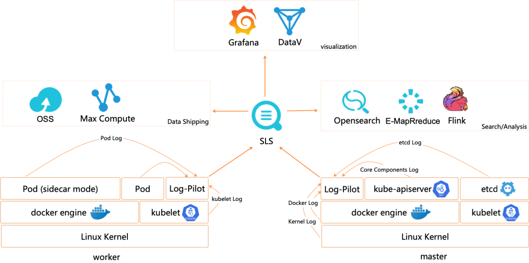 对于用户侧日志,用户可以使用阿里云的 logtail、log-pilot 技术方案将需要的容器、系统、节点日志收集到 SLS 的 logstore,随后就可以在 SLS 中方便的查看日志。
