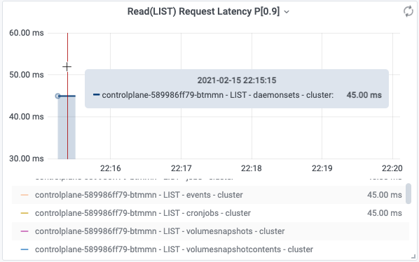 下图表示在采样周期内,APIServer 收到 LIST daemonsets 的请求,有样值的采样周期内 P90 RT 是 45ms。