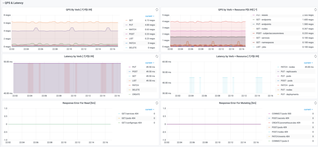 该部分可以直观显示请求 QPS 以及 RT 按照 Verb、API 资源进行分类的情况,以便进行聚合分析。还可以展示读、写请求的错误码分类,可以直观发现不同时间点下请求返回的错误码类型。