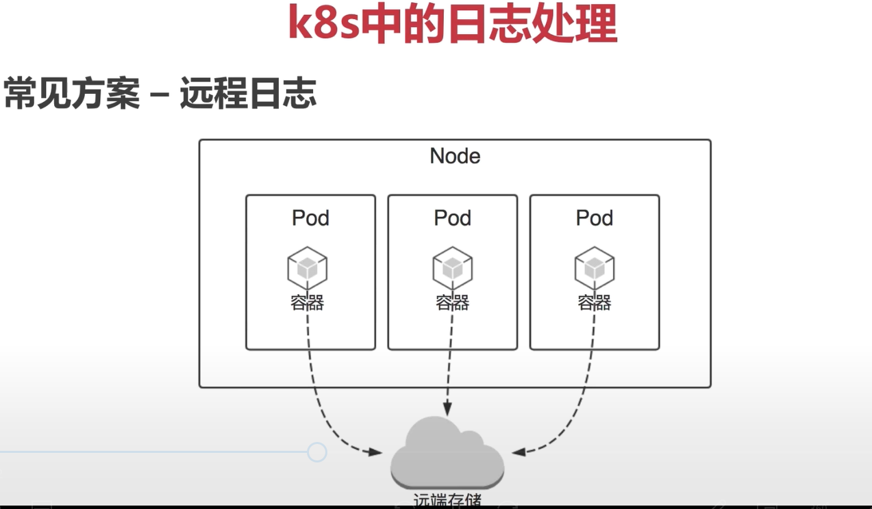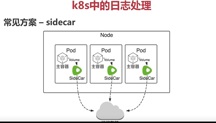 在每个podz中跑一个sidecar,sidecar会和主容器共享Volume,他可以访问到所有的日志文件,然后把日志文件转发到后端存储。