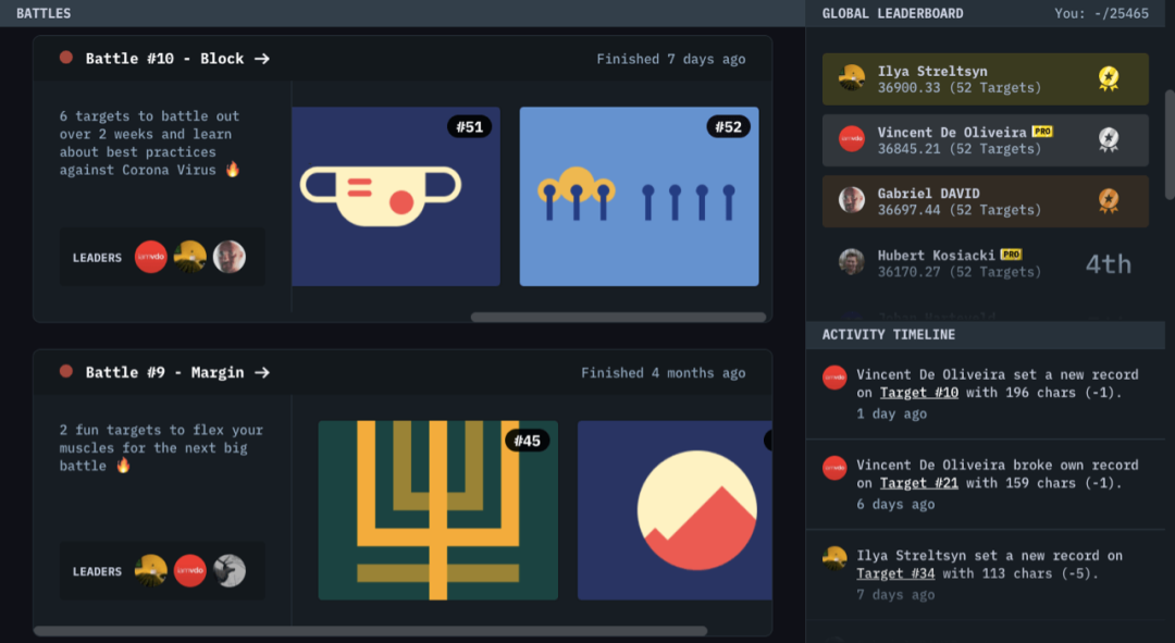 在线比拼 CSS ,一个挺有趣的竞争性游戏,一共有12个级别,需要你用 HTML和 CSS 100%还原它给出的页面,然后再尽量减少代码,你也可以查看全球的排行榜,看解决方案。