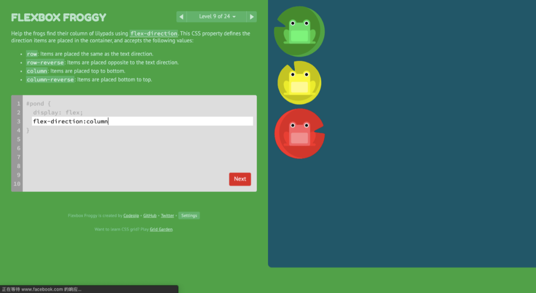 一个引导式的学习 Flex 布局的游戏,用 flex 布局让青蛙跳到荷叶上就算完成,游戏里面几乎包含了所有常用的属性,这样学习起来很有趣嘞,形象好记忆,谁要是 Flex 布局还不熟的话,在这多练练。