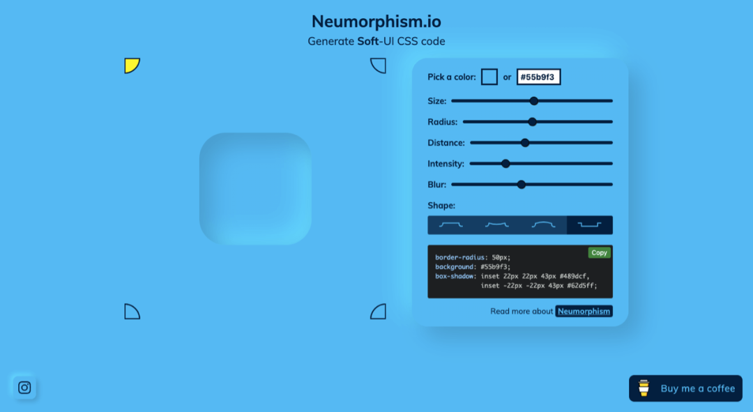 可以轻松实现新拟态效果,不仅可以修改颜色或填写色值,也可以修改尺寸、半径、距离、强度、模糊效果以及形状等参数,同时提供了CSS代码可以直接Copy。