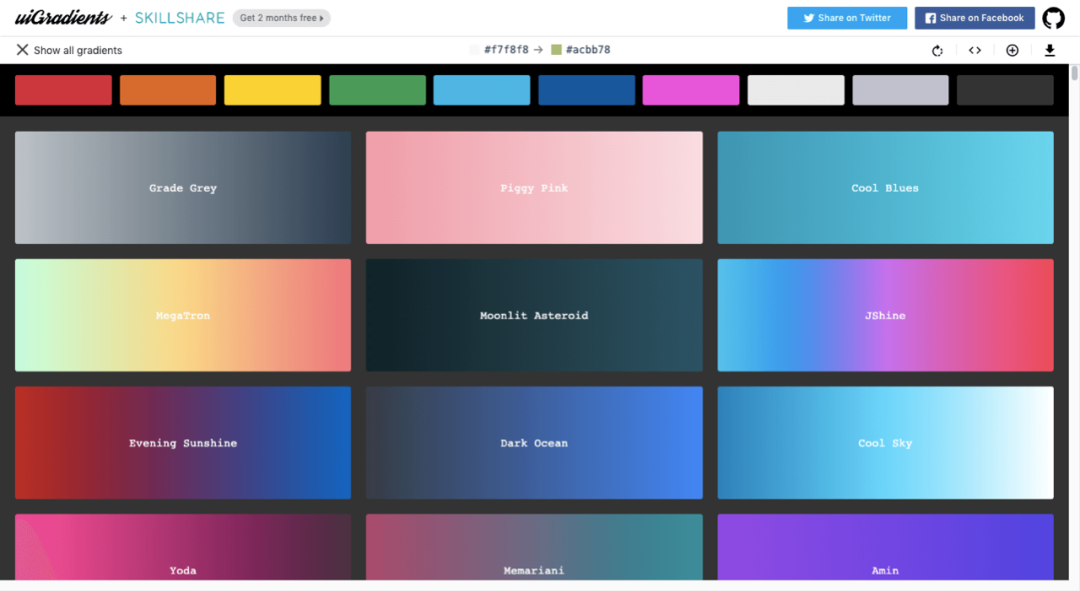 提供渐变色效果的站点,里面接近上百种渐变配色方案,可根据自己风格来选择搭配,能直接获得对应渐变配色的 CSS 代码。