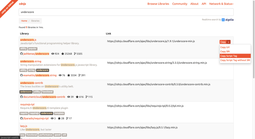 CDNJS 为开发者提供最新的前端 Web 开发资源,免费使用,无使用限制。你可以直接在自己的网页上引用这些 JS 文件。进入 CDNJS 网站后,搜索你想要的资源库,找到后点击项目后方的[ Copy Script Tag] ,然后贴上就可以用了。目前 CDNJS 在 Web 前端的 CDN 服务中排名第二(第一名是 Google),性能出色。