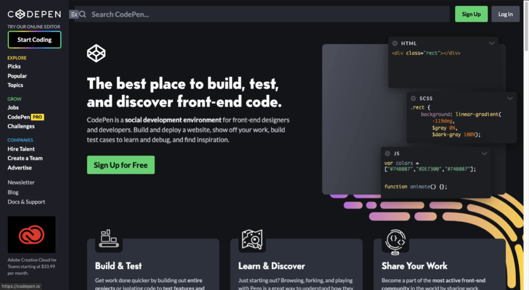 站如其名,CodeSandBox 网站提供一个在线开发环境的“沙盒”,主流的框架如 React、Vue、Angular 等,都可即开即用、实时编译预览,非常方便。