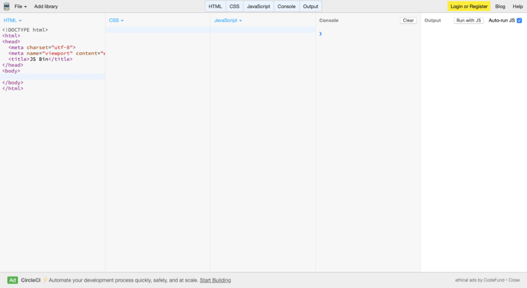 另一个轻量级在线编辑器网站,界面简洁干净,临时想调试简单的 HTML 或 JS 代码可以考虑去这里试一试。